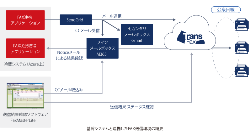TransFaxを新たなFAX送信の基盤に採用した決め手となった1つが、同社の基幹システムとの統合性である。新たにAzure上に構築した基幹システムでは、画面内にFAXのメニューが用意されており、ユーザーはそこからメール配信システム(SendGrid)を経由してTransFaxへ連携し、取引先にFAXを送信する仕組みとなっている。さらに、その送信結果のステータスも基幹システムへ連携し、担当者は確認することができる。